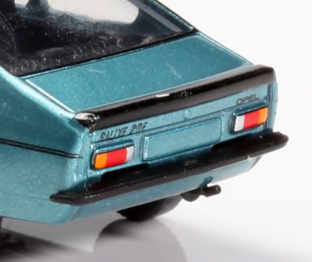 Die Detailaufnahme zeigt den für dieses Modell typischen Heckspoiler und die Stoßstange, beides in mattschwarz gehalten. WIKING verzichtet auch nicht auf die Typenbezeichnung am Heck "Rallye 2.0 E"