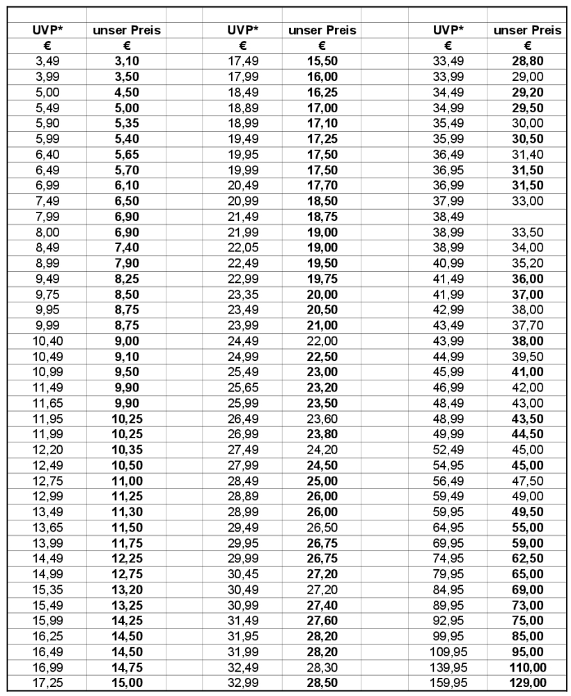 Da die Firma WIKING zum Jahresende 2010 die Preisgruppen abgeschafft hat,haben wir eigene Zwischenpreisgruppen eingefügt.Sie erkennen diese an der Kommastelle. (Stand: 10.1.2019)